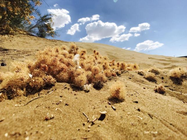 茫茫沙漠,只见沙黄天蓝、云淡风清,令来自城市中的游客们视野为之开阔,心情也顿时舒畅起来。因为环境艰苦、道路险远,库木塔格沙漠在唐代被称为“大患鬼魅碛”,至今还蒙着一层神秘的面纱。