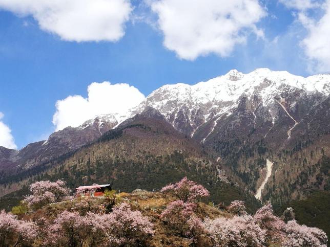 在林芝,有一个三面环山的赏花胜地,叫做桃花沟。桃花沟是一片天然野生桃林,高处有水源,四周林木葱茏,终年碧绿苍翠,间有流水,清澈见底。每年的三、四月,寒意未尽,但是这片巨大的野桃林给林芝带来了一片壮丽的春天,当远方的雪峰还有皑皑白雪,桃花却已如醉霞绯云般地争相斗艳。