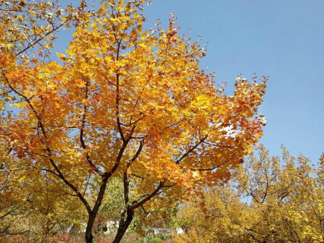金黄的黄叶林、碧绿的松林、耀眼的白桦林,搭配着瓦蓝的天,成全了红叶谷中完美的五彩秋色。红叶谷观赏红叶最好的季节,是每年秋天的九月二十五日到十月十日。半个月的红叶观赏期,国庆节正好合适。