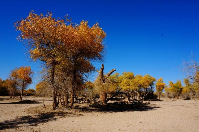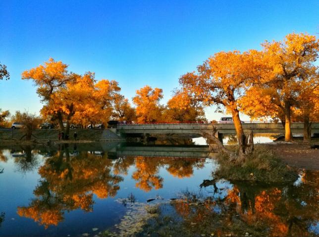 这里的天空古朴、高远、这里的大地苍劲、广阔,这里的水湛蓝、清澈。这里的树安静、茂盛,这里的一切都是那么的幽远深邃,美的让人移不开眼。额济纳的秋天,是属于胡杨林的,黑河沿岸数十万亩的胡杨,曲折绵延,漫步于胡杨林中,仿佛徜徉在金色的海洋之中,这样绝美的景色如果错过了,就只能明年再看。