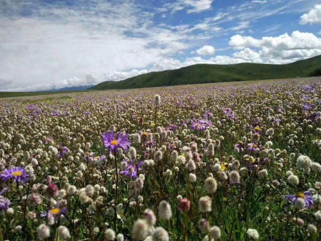 红原县俄木塘草原花海,位于该县壤口乡境内,紧邻省道209线,是一片罕见的鲜花海洋。白天,人们可以安逸地坐在鲜花织成的地毯上,悠闲自在,喃喃细语,空旷辽远的天上变幻着不同层次的蓝色,是自然调制的色彩,浅蓝、深蓝、湛蓝……