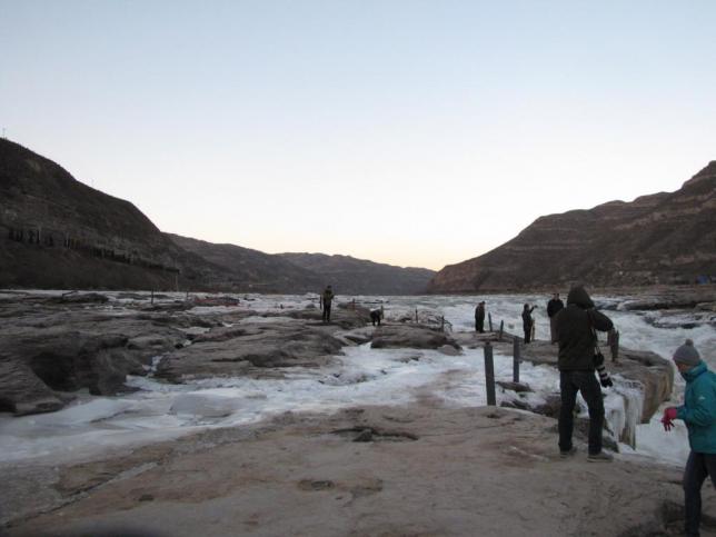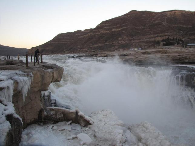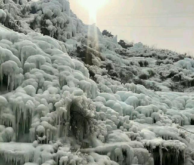 整个水面全部冰冻,结出罕见的巨大冰瀑,流水以下行的姿态被寒冷冰封,别是一番壮美。