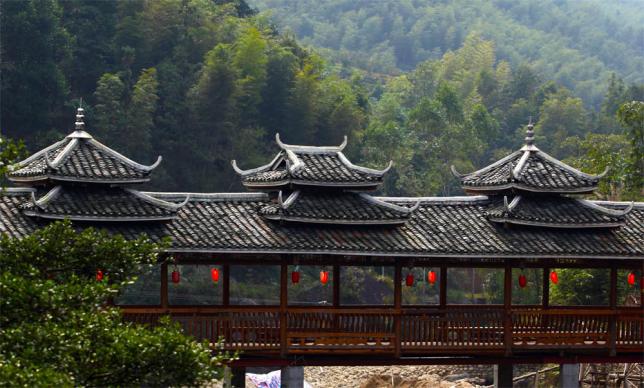 三江的建筑大多层层叠叠,有好几层屋檐,而且大都靠近水边,临江临水而建,但与凤凰的吊脚楼又有很大不同,最有代表性的建筑就是三江风雨桥,横跨两岸,远望精巧秀丽,近看则不得不佩服侗族同胞的智慧,因为全桥未用一颗钉子,全是古老的榫卯结构。
