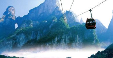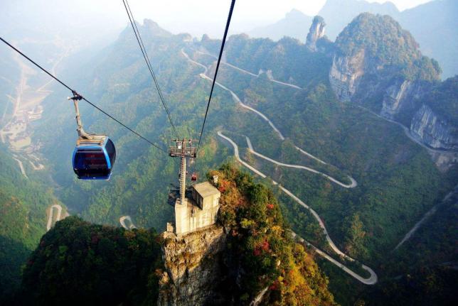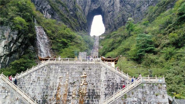 得名于天门洞,天门洞南北对穿,门高131.5米,宽57米,深60米,拔地依天。天门山不仅自然风光壮丽,也凝结了人类智慧的结晶:环绕山体的99道弯的盘山公路,天门洞前的999个台阶的天梯,山体隧道内提升高度340米的手扶电梯。而更让人印象深刻的,是山顶悬崖边上的玻璃栈道和鬼谷栈道。