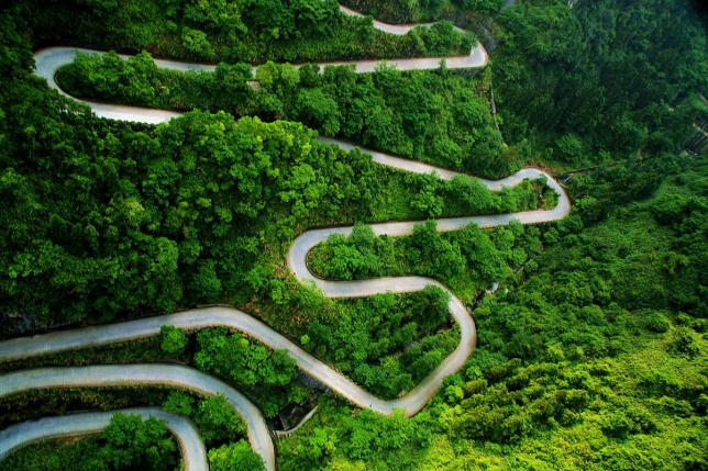 通天大道:蜿蜒迂回,扶摇直上,因通往有着通天门户之称的天门洞而得名。大道全长11km,两侧绝壁千仞,空谷幽深,180°急弯此消彼长,有着“天路”的美称