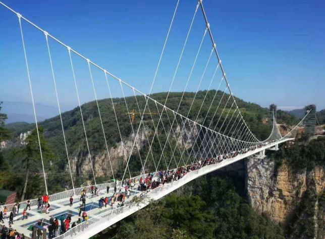 张家界大峡谷玻璃桥:具有世界最高蹦极的世界最高、最长的玻璃桥。大桥建在大峡谷两侧的峰顶上,横跨大峡谷,桥拱距谷底相对高度约400米,全长约370米,桥面全部采用透明玻璃铺设,桥中心有全球最高的蹦极。站在桥上,脚下400米处的谷底全景尽收眼底。
