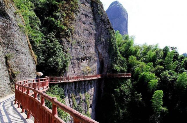 天梯栈道:我们现在所步行的这段游道坡度很大,栈道的木板很窄,依次往下延伸,就像一架天梯,把我们送往迷人的仙境。我们叫它天梯栈道。