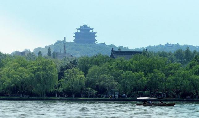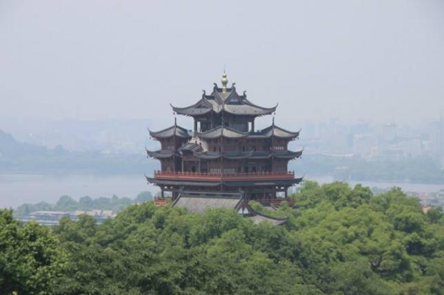 我们沿着小路继续往上走,走到了江湖汇观亭,它是紫阳山最高处。我们沿着旋梯上楼,向东眺望,看到了高楼大厦,从西边看能看到美丽的西湖。
