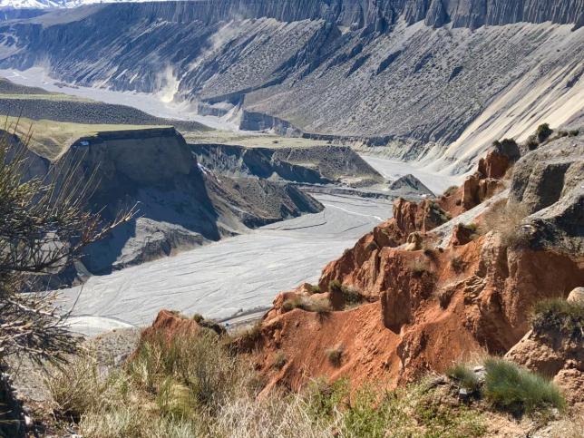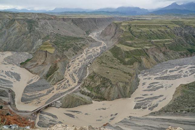 从高空看,安集海峡谷的色彩异常丰富,河流切割大地,将不同颜色的岩层冲刷溶解,形成了一幅绚丽多彩的大地抽象画景观。
