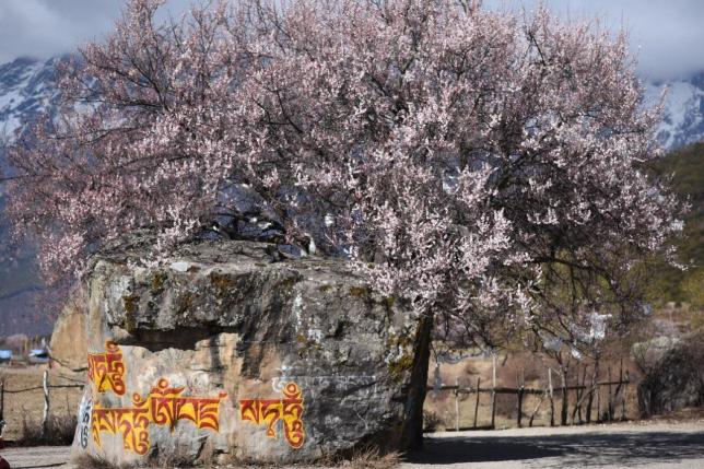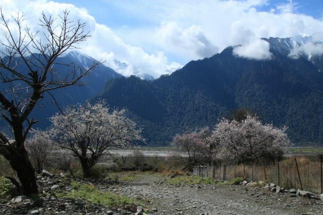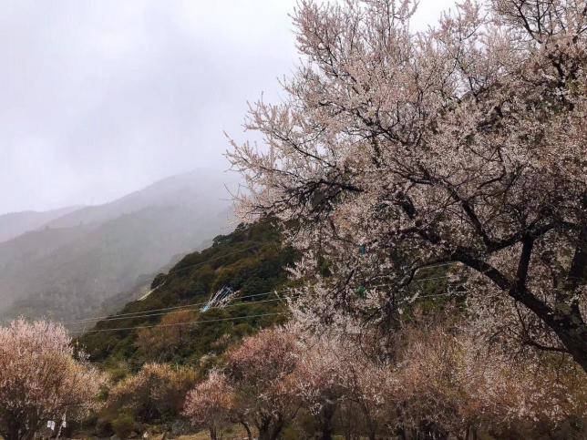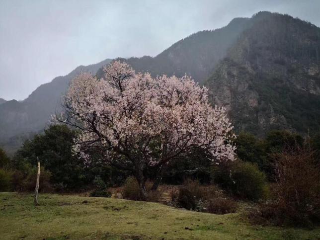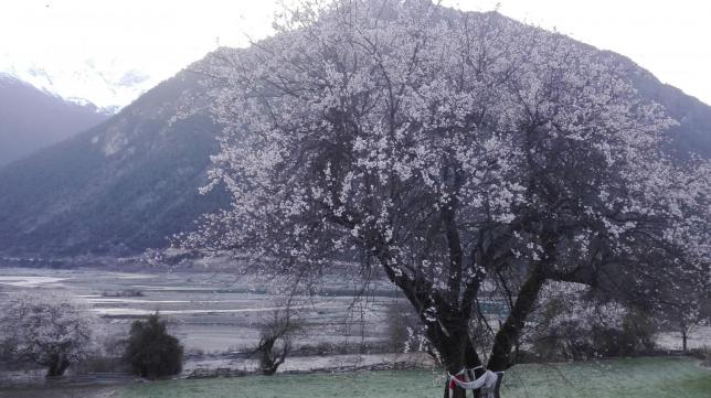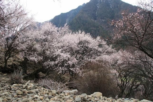 每年的三月中旬至四月中旬,当连绵起伏的群山还披着厚厚的白色雪衣,林芝漫山遍野的桃花开始铺满山坡,绵延至河谷,在雪山冰川的映衬之下怒放着野性的壮美。