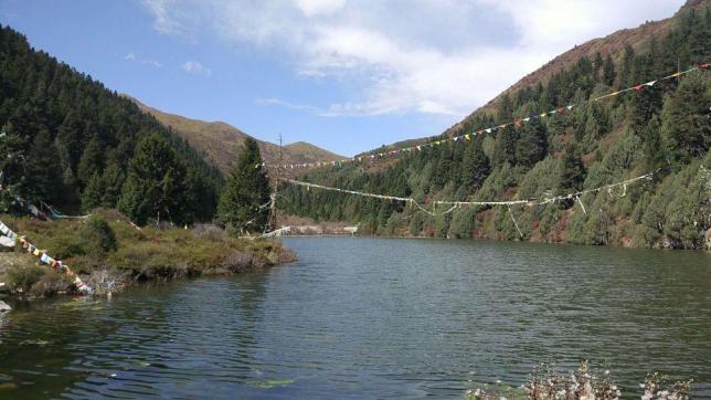 骨麻湖四周是茂密的原始森林和高山草甸,苍劲的古柏、隽秀的杜鹃、广阔的草场、或黄或红的小花,既为骨麻湖点染出清新爽快的绿色活力,又为骨麻湖谱写出了一首悠扬的生命之歌。