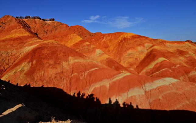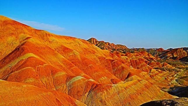 张掖是中国丹霞地貌发育最大最好、地貌造型最丰富的地区之一。驱车来到山脚下,刚一下车,我就被眼前的景象震撼了:一座座山连绵起伏、相接不断,更为神奇的是竟然没有一株草、一棵树,山体主要由红色的砾石、砂岩和泥岩组成,交错层理,四壁陡峭,色彩斑斓,简直是大自然创造的一幅油彩画,色彩深浅相间,使我联想到我最喜欢吃的红烧肉。张掖集雄、险、奇、幽、美于一身,揽色彩斑斓于一体,不负“中国最美七大丹霞地貌之一”的美誉。