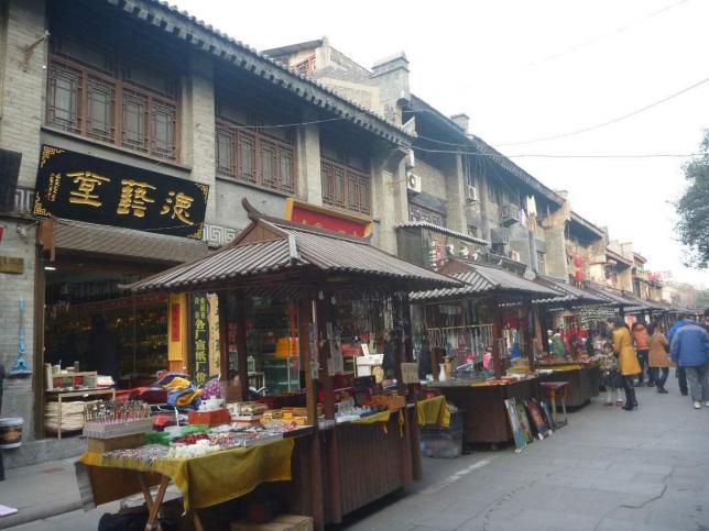 从钟楼南行,将至南门时往东拐便是书院门古文化街。抬头望望街口古韵十足的高大牌楼,起步迈入宽阔平整的青石板路,你便进入了一个古色古香,充满奇珍异玩的世界。整条街由清一色的仿古建筑组成,一家家店铺里什么稀奇古怪的都有,除了文房四宝、字画、青铜器、玉器,还有很多民间特色艺术品,像是皮影、剪纸、手工编织等。路边有许多小摊售卖一种形如鸡蛋、身上有孔的黝黑乐器:埙。