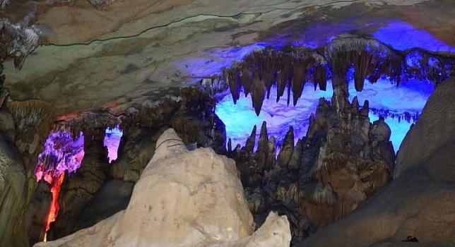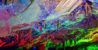 走出清风洞,仿佛从另外一个世界走出。接着,我们继续游玩了霭云洞。听导游说,在下雨天,里面会起雾,像仙境一样。可惜今天没下雨,我们只能在洞中看人工特效。突然,我看见了犹如莲花状的岩石,在远处看,就会使人疑惑,因为莲花状的岩石真的很像莲花。走着走着,我们看到了一个甘露池,其实水很浅,大概只有1米高左右,边上的钟乳石倒映在水里,让你以为在这水里也有一个景点呢。