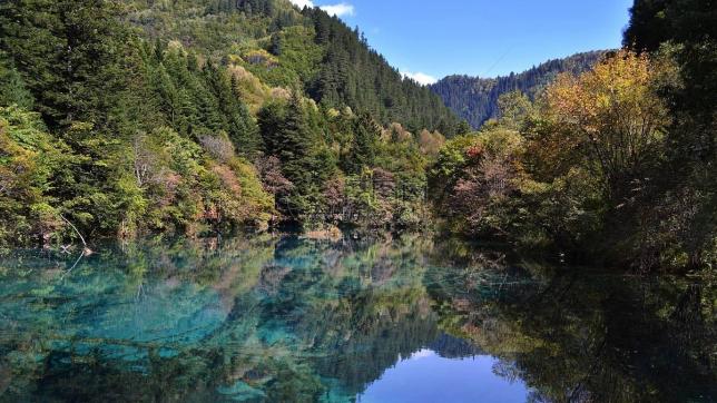首先到达的一个景点——熊猫海。熊猫海是一片比较开阔的海子,得名大概是来源于大熊猫喜欢来这里喝水、散步、觅食。我不禁赞叹起来,大自然的画笔真的是太奇妙了!这水的颜色深蓝如蓝天,就像用画笔在这里涂了一层厚厚的颜料。四周绿树衬托,在阳光的照耀下,周围的山、树木和人群都倒映在了水里。把整个湖弄得绿蓝相间,一片迷离。是画中有人,还是人在画中?