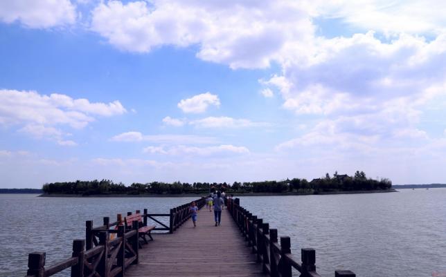 经过了半小时,我们终于抵达了浮龙湖生态景观区,下了车,我们神采奕奕地在广场上走着。到了广场边,我抬头一望,湖心岛就在桥的尽头,被薄薄的雾霭笼罩住了。走在栈桥上,桥约三米左右宽,桥身从湖北岸蜿蜒延伸到了南岸上,真有一种置身于青岛栈桥的感觉,低头看一看湖水,湖水里绿油油的水草随波摇曳,成全结对的鱼儿穿梭其中。