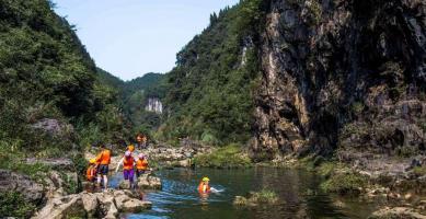 两岸绝壁陡峭、岩石嶙峋美丽、滩险壁绝,水质清澈、大小潭无数、瀑布十余条迭起、险滩二十余处,被驴友称为誉为湘西第一条五星级户外精品线路,水从一天然水洞穿过,出了洞口。