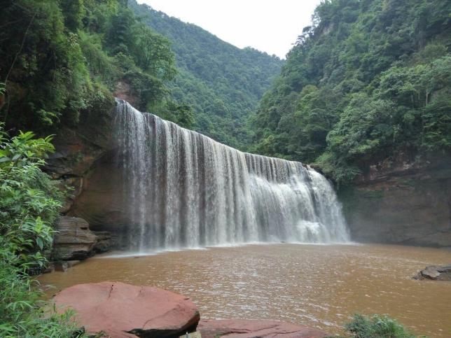 这是一条瀑布,悬挂于红色丹霞悬崖上,倾泻而下的水流如雷贯耳。阳光照射之下,呈现五彩缤纷的彩虹,偶尔还能看到奇妙的“佛光环”。周围环境清幽,原始森林茂密,空气也很清新。