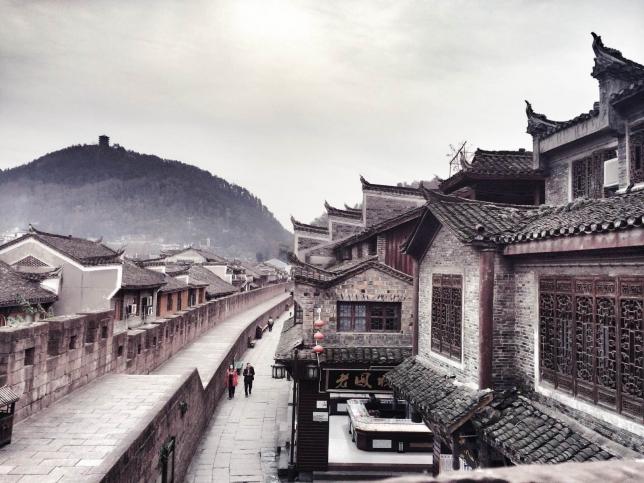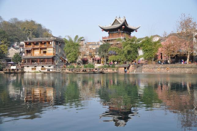 凤凰古镇老街上的建筑与关中民居有所不同,从外观上看,它更像徽州民居,粉墙青瓦,屋脊中央和两旁均有装饰,正中为莲花或梅花,两边有兽脊或龙头。古镇的建筑格局是按照一只飞腾的凤凰建造的,每当夜晚灯火燃起的时候,站在镇东面山上俯瞰,网状般的街道便可勾画出一只展翅的火凤凰,左翅亮痕,便是“S”型老街的中央街道。