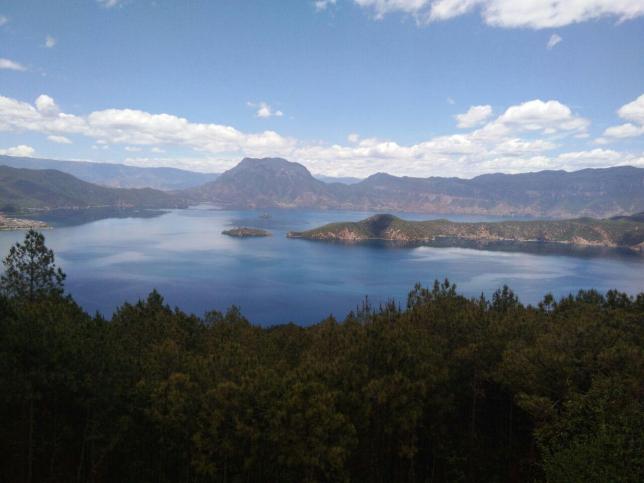 湖中各岛婷婷玉立,形态各异,林木葱郁,翠绿如画,身临其间,水天一色,清澈如镜,藻花点缀其间,缓缓滑行于碧波之上的猪槽船和徐徐飘浮于水天之间的摩梭民歌,使其更增添几分古朴、几分宁静,是一个远离嚣市,未被污染的处女湖。