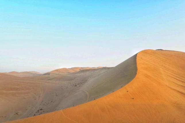 沙山的四周是广袤的草原,无边无际的湿润和绿色中突兀地屹立着一座寸草不生的沙山,它的魅力就在于会发声和堆积在这里几百年的沙子经历无数风雨,既没有向四周扩散,也没有被绿色植被吞噬,而且沙子从山顶被攀登沙山的人踩动滑下后会慢慢自动爬上去。