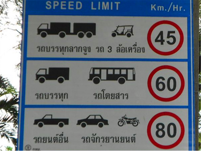 泰国各地有不同的时速限制,时速以公里为单位,与表盘上一致。一般而言,住宅商业区一般限速40-80 km/h,高速公路一般限速90-100/h,最高不能超过120 km/h,超速一般罚款500-1000泰铢不等。