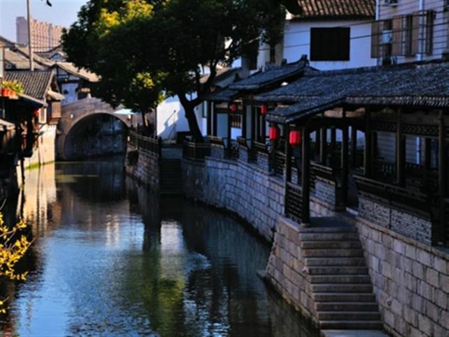 练塘古镇位于上海西南方向,是陈云同志的故乡,老街就在镇中市河两侧,两条石板路隔河相望。街道两旁的民居重脊高檐,过街楼,河埠头,长廊,幽弄和深宅使古镇呈现古朴,恬和、幽静的风貌。横跨市河的10多座元、明、清古桥掩映在垂柳之间,各桥各式,小木船不时轻轻划过,人走其上,船行其下,桥影、船影、屋影、人影在微波中荡漾。两岸老房子的建筑特色对比鲜明:上塘街多连续的两层楼,门面临街,以前多为店铺,屋后临水,上筑楼台兼顾堆货和观景纳凉;下塘街多民居院宅,圆头山墙,粉壁黛瓦,前门沿河。