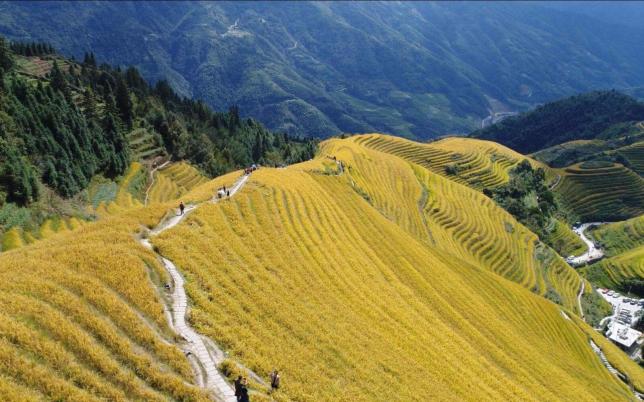 龙脊梯田位于广西龙胜各族自治县龙脊镇平安村的龙脊山,指的是在龙脊山上开发出来的梯田。龙脊梯田开垦于元代,完工于清朝,距今也有了近700年的历史。龙脊梯田的美一年都不曾消损,悠然自得田园生活,返璞归真的感觉让人沉迷其中。春天,灌满水的层层梯田映衬着天光,水天相映;夏天,绿油油的禾苗随风舞蹈;秋天,五彩斑斓流光溢彩。