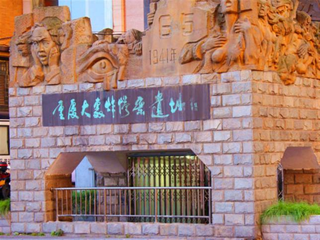 八一路与瓷器街交汇路口西北方向,在旁边若干林立的高楼大厦底端,驻立着一座石雕。这就是“重庆大轰炸惨案遗址”。重庆解放后,有关部门对较场口大隧道进行了清理维修。在重庆市渝中区较场口建立大轰炸惨案遗址。1987年,7月6日,为纪念七七事变50周年,“日本侵略者轰炸重庆纪事碑”落成仪式在此举行,并将该处列为重庆市文物保护单位。