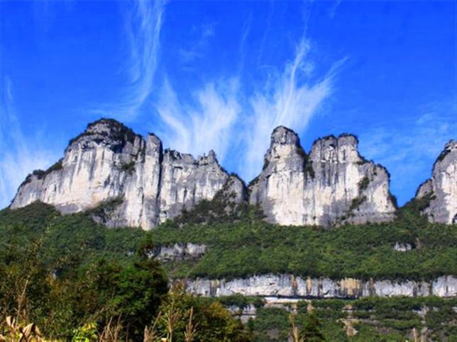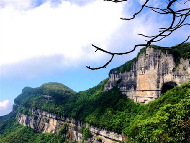 绝壁栈道是金佛山最为雄奇的景观, 栈道全长其实有3.5公里,其中1.5公里几乎是在垂直的90度崖壁上建成,离地面40-50米,行走时如凌空微步,步步惊心。这一段一般被称为绝壁栈道。它如一线串珠连起了金龟朝阳、箭竹海、灵官洞、生态石林等景点。其中,燕子洞是与恐龙同时代的古岩燕栖息之地,若遇岩燕外出觅食或归巢,游人可看到万燕齐飞的壮观景象。行走栈道,雾日穿云而行,晴天一揽众山。是观杜鹃、彩林、云海、佛光的最佳位置。