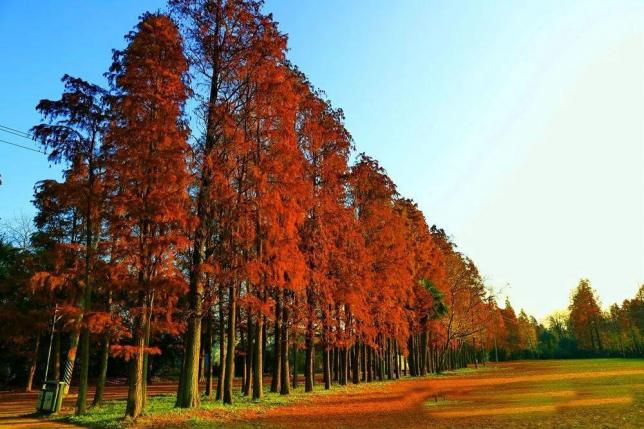 水杉,常被人们称作“活化石植物”,每年到11月前后变装,原本翠绿色的叶片换成一袭古铜色,成排列植的水杉往往成为一道靓丽的风景线。深秋初冬之际,最美的视觉盛宴莫过于那一排排高大、笔直的水杉。