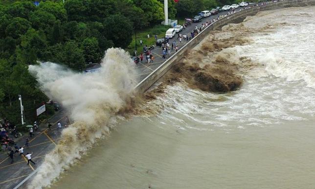钱塘江潮被誉为“天下第一潮”,是世界一大自然奇观,它是天体引力和地球自转的离心作用,加上杭州湾喇叭口的特殊地形所造成的特大涌潮。