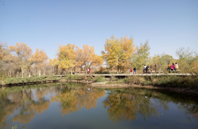 金湖杨国家森林公园位于泽普县西南36公里处亚斯墩林场境内,坐落在叶尔羌河冲积扇上缘。远处是巍巍昆仑山,脚下的叶尔羌河支流奔腾不息,从公园内穿越而过,雪域昆仑和叶尔羌共同孕育了这片神奇的土地。金湖杨国家森林公园内以广袤的天然胡杨林与开阔的叶尔羌河及河两岸平坦、荒芜的戈壁滩形成独特的自然风貌。