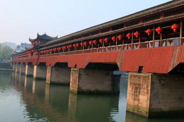 熟溪桥为重檐歇山顶木结构建筑。桥下九拱十墩,桥身宛如长廊,桥中楼阁高耸,重檐翘角,甚为壮观。廊柱与梁匾上,沙孟海等名家书法,各具风骨。