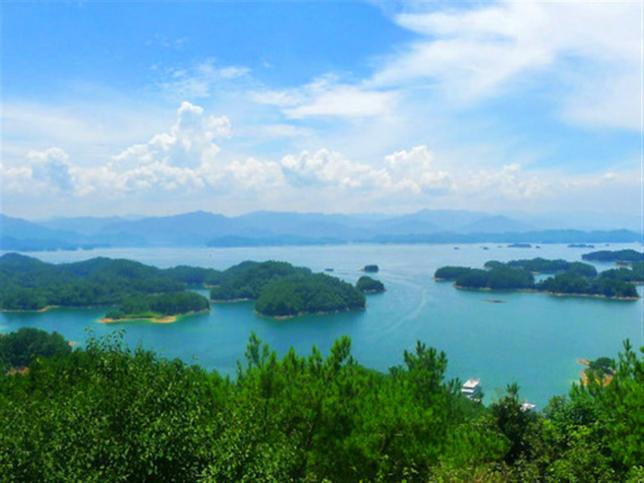 在黄山尖登临山巅,向西北俯瞰,九十多个岛屿尽收眼底,如同“公”字,像一串串珍珠撒落在湖面。向东南眺望,一道幽深的峡谷从黄山尖和羡山岛之间穿过;向西南远眺,一望无际的大湖,姥山岛隐在云雾之中。千姿百态的岛屿和迷离曲折的港湾,构成了一幅幅美丽的山水胜景。