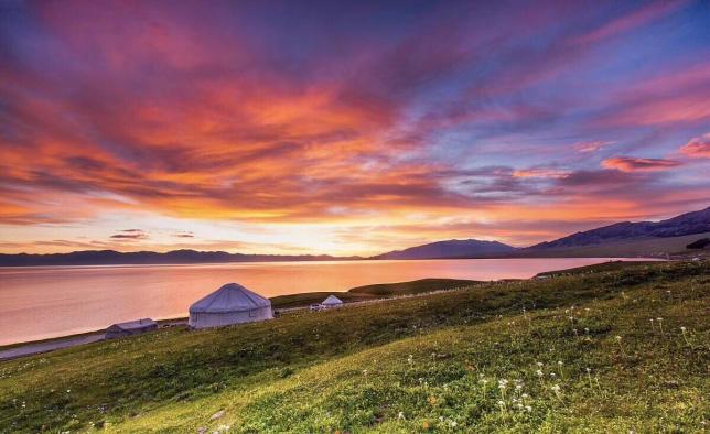 赛里木湖背靠雪山,被广阔的草原环抱,每年六七月的时候,草原上盛开着黄色的野花,湖水锃蓝被称为“大西洋最后的眼泪”。