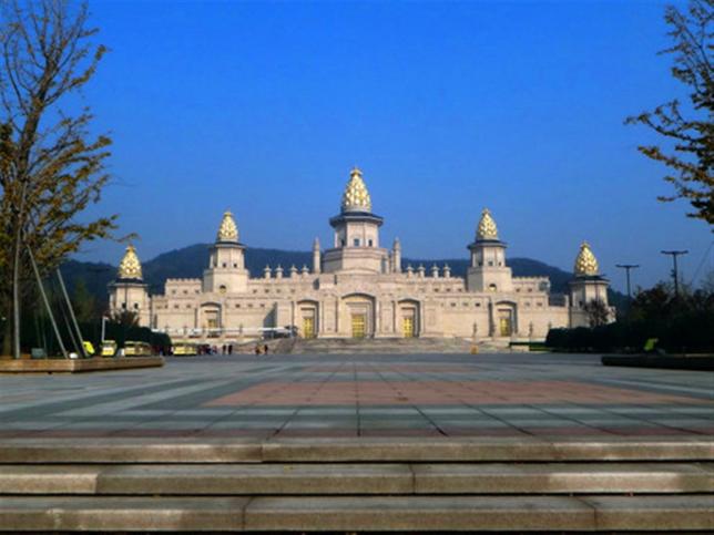 梵宫广场和灵山梵宫的主建造颜色浑然一体,宽大的广场也使得梵宫显得更加的气势恢宏。广场东侧是蔓飞龙塔,南侧是五印坛城,均与灵山梵宫遥相呼应,形成“百川归海”的意象。这里是通往梵宫的必经之路,广场全是大理石铺就而成的,十分的干净。