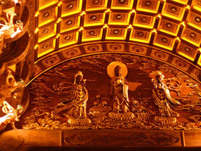 灵山梵宫坐落于烟波浩淼的太湖之滨,钟灵毓秀的灵山脚下,气势恢宏的建筑与宝相庄严的灵山大佛比邻而立。梵宫建筑气势磅礴,布局庄严和谐,总建筑面积达7万余平方米,造价约18亿。进入梵宫,犹如游走在梦中一般,整座宫殿美轮美奂,精妙绝伦,极尽奢华,满目金碧辉煌。游览梵宫时,不要错过灵山梵宫佛教文化珍宝馆,在等待观看《灵山吉祥颂》的空挡,不妨抬头望一望穹顶,1500盏金光灿灿的莲花灯刹那间开启。