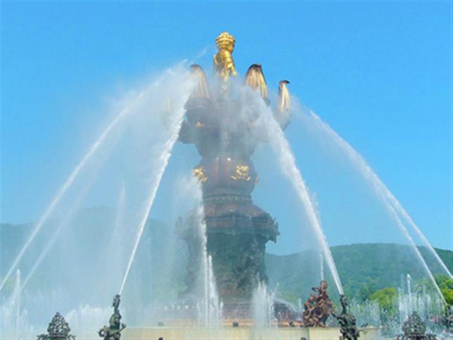 九龙灌浴位于灵山大佛的广场里,是国内最大的音乐动态青铜雕塑群,讲述了释迦摩尼出生的故事。这里是灵山胜境的一大景观,随着音乐的伴奏、莲花开合、太子佛从中徐徐升起,在九龙喷水形成的水幕中自转一圈。九龙灌浴每天有五次表演,表演完毕后,广场周围的龙口会喷出功德水,游客可以带走。若想观看九龙灌浴表演,可提前前往选择位置。