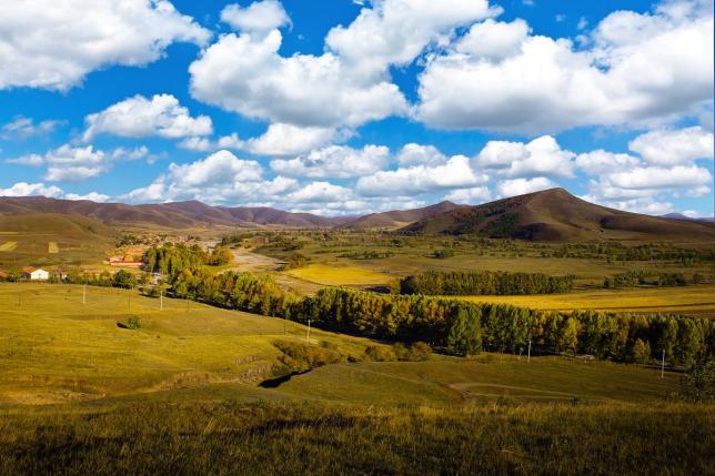 这条线曾经是清朝皇帝塞外巡游的路线,每到秋季,草原褪去了绿色,红的、黄的层林尽染,在蓝天下,好一番壮丽的景色。