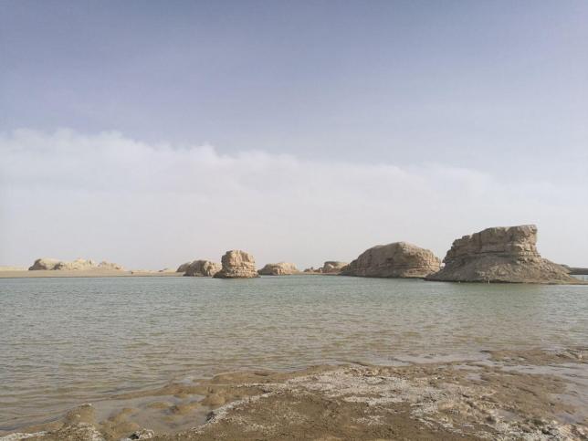 每年冬天,雅丹土丘与蔚蓝的湖泊冰面相互交融,形成一片50余平方公里的水上雅丹奇观。图为空中俯瞰,雅丹土丘与湖泊冰面相互交融,景色极美。