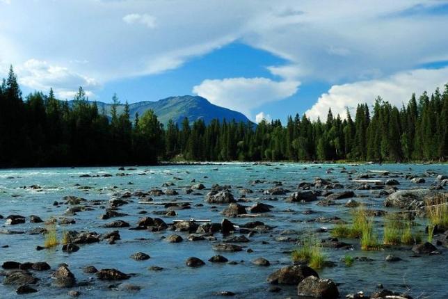 喀纳斯湖水沿河倾泻而下,在山谷中蜿蜒,河滩上绿草如茵,两岸林木葱郁。喀纳斯河是布尔津河的主要支流,河的上源就是喀纳斯湖。湖水倾泻而下,在山谷中蜿蜒,形成了卧龙湾、月亮湾等秀丽绝伦的水湾河滩。喀纳斯湖南端出水口以下到鸭泽湖的河段巨石密布,水流湍急,浪花四溅;鸭泽湖到卧龙湾河段,则河面宽阔,水流缓慢,河滩上绿草如茵,两岸林木葱郁。