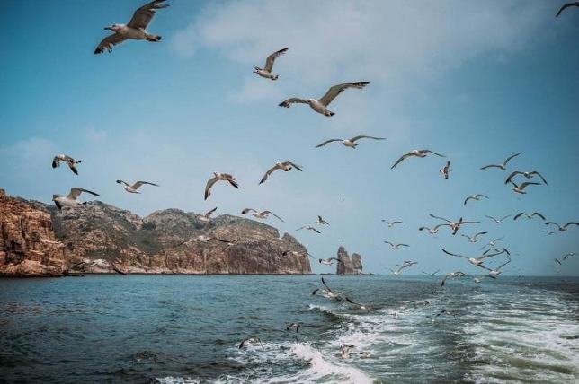 万鸟岛又称车由岛、高山岛,坐落于长岛诸岛中部偏东,在浩淼的汪洋大海之中,简直是一粒微不足道的沙粒,然而海深魅力大,岛小情趣多,岛上栖居着上万只海鸥,全岛海岸线长1.25公里,海岸地貌悬崖陡壁占90%以上,这些如劈如削的断崖,多石英岩与极岩,破碎性强,经风化和海蚀,崖壁此凸彼凹,石阶、石台、石窟、石穴鳞次栉比,形成一座自然的海鸥“石楼”,虽然知道会有很多海鸥,但还是被震撼了,数不清的海鸥在天空展翅高飞,密密麻麻的海鸥们时而与游客们互动着,时而在海面上飞来飞去,感觉就像在碧蓝的天空舞动一般。