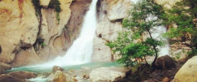 八水河是以八条漳水汇集成一条不长的山涧而得名。这条山漳,泻于两山之间,涧底大石垒垒,水从乱石隙中奔腾而下。涧水穿山越岭,沿路汇集了数十条溪水,聚成一股急流,奔腾而下,在一处高约30米的崖顶平台上,平直地冲出数尺之外;水在半空中飞旋了几曲折之后,会合成一道长约30米,宽约5米凌空飞泻呈八字形的瀑布,顺着九十度的峭壁跌入崖下的碧潭之中从岩顶冲下。那气势,宛如一条矫健的玉龙,从悬崖之颠,腾云驾雾,呼啸而下,击得潭中水花四溅。