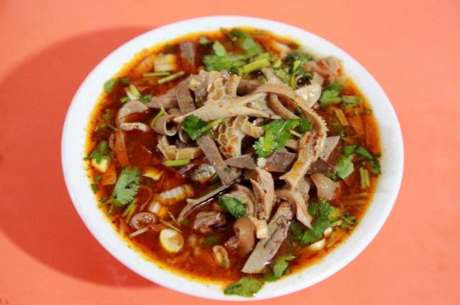 烩羊杂碎,“那红色的便是辣椒油,绿色的是青葱香菜末,油色下面是乳白色的鲜汤,喝一口鲜汤吃一口杂碎,不膻不腻,味道香醇浓郁。”