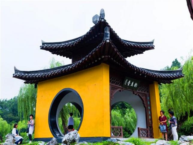 三面临水,游览瘦西湖唯一一处需要折返的景点,伫立于此,五亭桥、凫庄、小金山、白塔尽收眼底,是观赏风景绝佳之处。站在斜角60°看去,正洞成正圆,五亭桥横卧波光,侧洞成椭圆,白塔竖立云表。加上钓鱼台一景,称之为“三星拱照”。钓鱼台巧妙运用“框景”手法,成为中国园林“框景”艺术的经典之作。