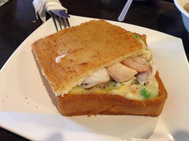 棺材板,将面包切成薄薄的面包块,下锅油炸,炸到金黄色后捞起,掀起炸酥的一面,把中间挖空,再装入由鸡肝、鸡肾、鸡肉、豌豆、马铃薯、胡萝卜、地瓜粉、墨 鱼和虾仁等精心调制的作料以高汤煮成再用些牛奶芶欠,再于面包面上蘸上酱料,就成了大名鼎鼎的棺材板了。酥脆的外皮配上香滑可口的肉馅,香味浓郁,营养丰 富。