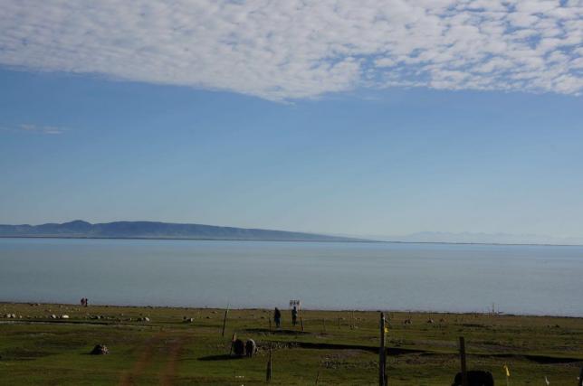 湖面群峰环绕,雪山倒影,烟波洁淼,碧波连天。水中游鱼欢跃,湖上鸟儿翱翔。湖滨是水草丰美的大草原,夏季的草原,野花争艳;环湖如画的农田,麦浪翻滚,菜花飘香;点点帐蓬,群群牛羊,生机勃勃,充满着诗情画意,犹如一幅美丽的天然画卷