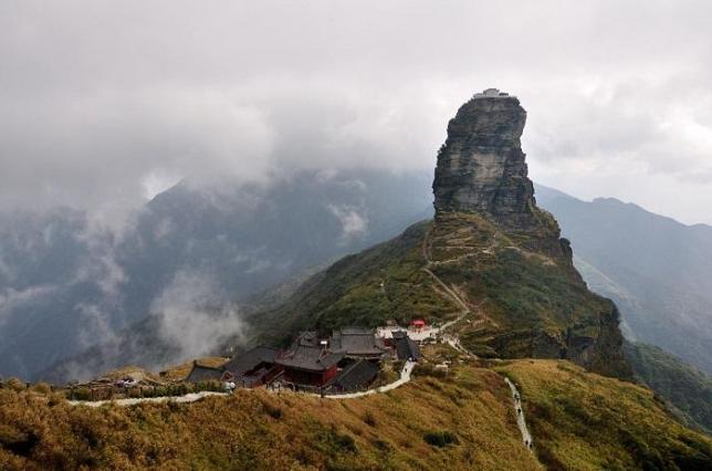 一块巨石,一片风景,一卷画轴,铺陈水墨光华。梵净山似乎并没有多余的色彩,白雾、黑石,白墙黑黛,加上被白雾拢聚的灵气围绕其中,怎么不是精美画卷。远山层叠被浓雾遮挡,厚纱笼罩灵山,简单的色彩勾勒,描出山岩突兀,绘写屋檐栏杆。层层渲染,墨色交织,勾勒飘逸出尘,绘制丹青本色。