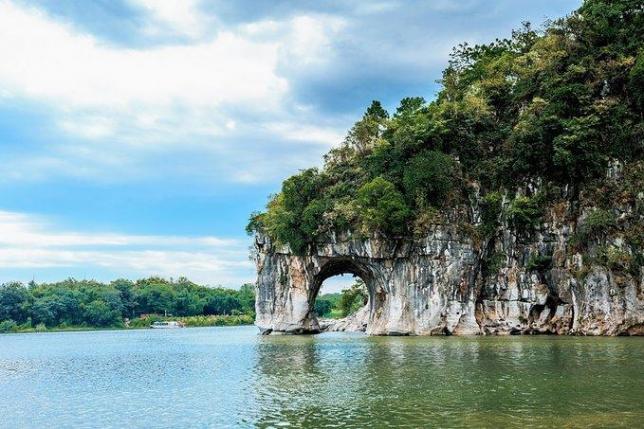 桂林象山以神奇著称。其神奇,首先是形神毕似,其次是在鼻腿之间造就一轮临水明月,构成"象山水月"奇景。因此,象鼻山是桂林的城徽山,是桂林旅游的标志山,它坐落在桂林市中心的漓江与桃花江汇流处,形似一头巨象,象鼻和象腿之间是面积约一百五十平米的圆洞,江水穿洞而过,如明月浮水。坐落西岸的象山水月与漓江东岸的穿月岩相对,一挂于天,一浮于水,形成"漓江双月"的奇特景观。